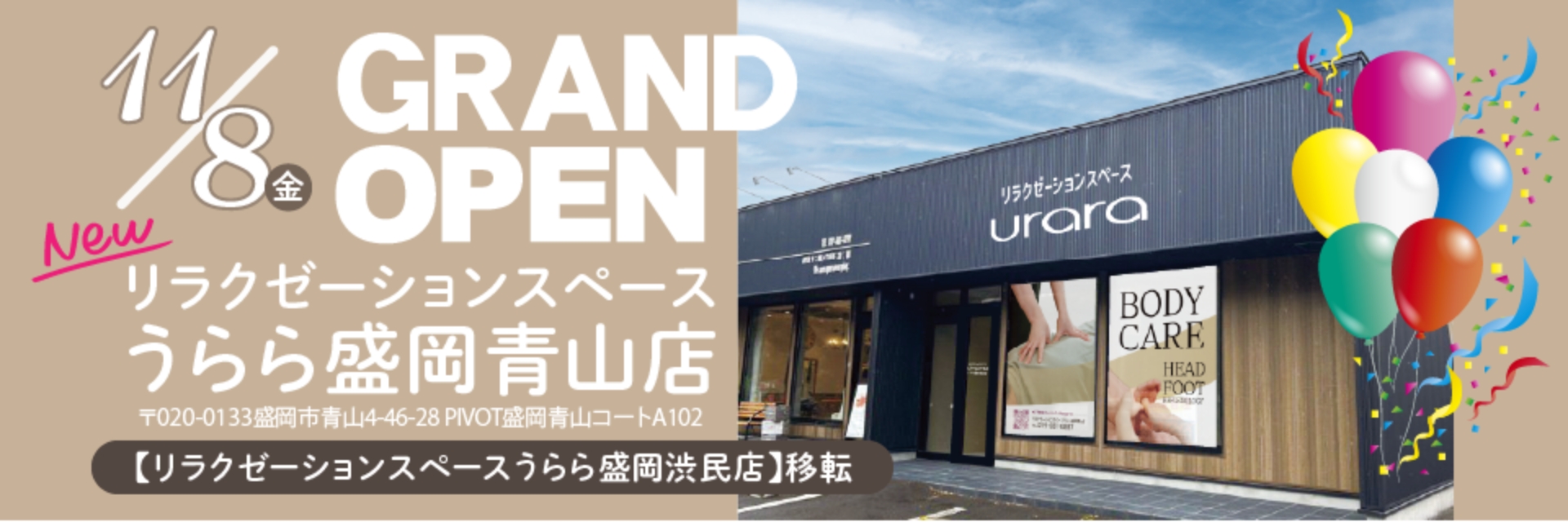 リラクゼーションスペースうらら盛岡渋民店 移転のお知らせ